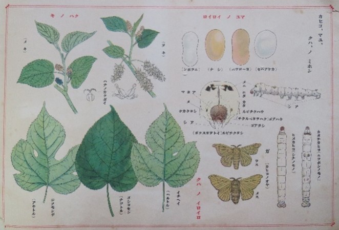 - 1p:蚕幼虫の外形・繭形と色・成虫外形及び桑の木と桑の葉の色々